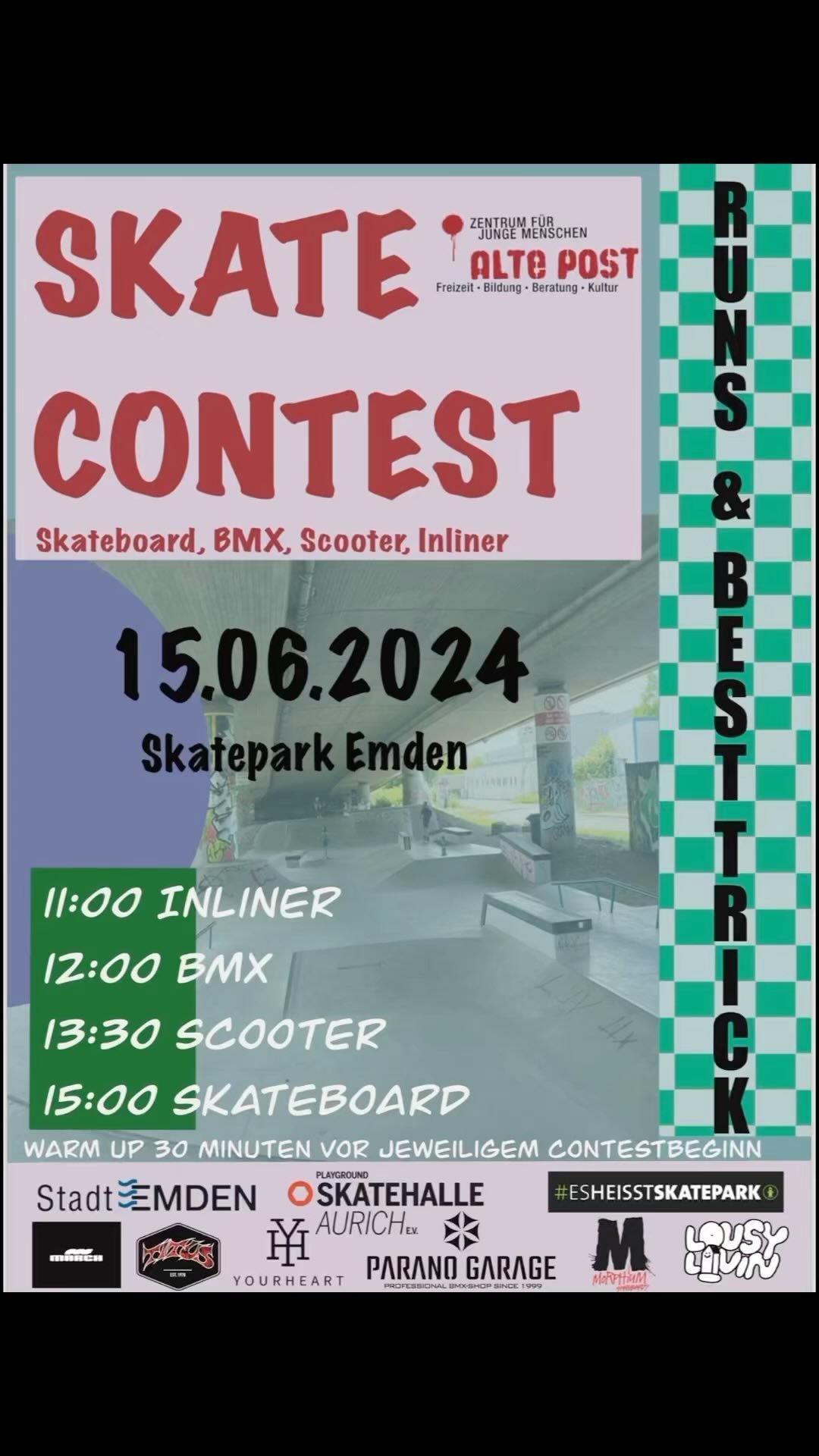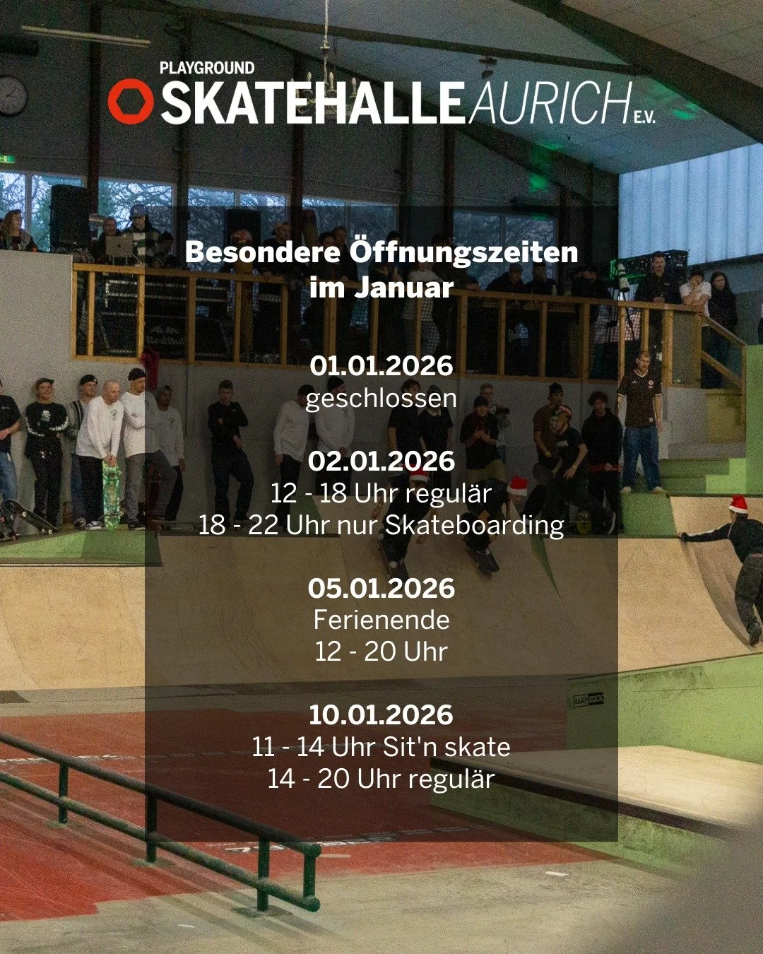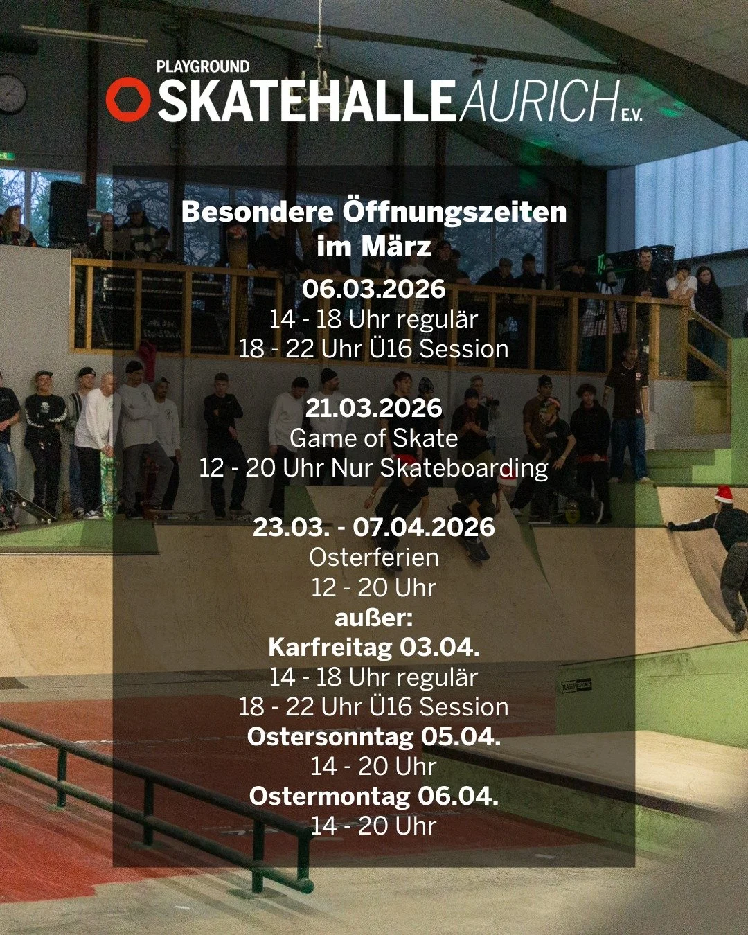 Skaten ist Extremsport und eine Skatehalle kein Spielplatz. Bitte lies dir vor deinem Besuch unsere Hallenordnung und ggf. die Nutzungsbedingungen für unser Verleihmaterial durch. Wenn du fragen hast, schau mal in unser FAQ oder frag unsere netten Mitarbeiterinnen und Mitarbeiter. Du erreichst uns telefonisch unter 04941 607770. Wir freuen uns auf deinen Besuch. Du willst nichts mehr verpassen? Dann folge unserem Whatsapp-Kanal!